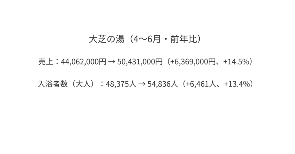 キャンペーン効果により、2025年4〜6月の売上高は、2024年の4,406万円から5,043万円へ約14.5%増加し、入浴者数(大人)も48,375人から54,836人と約13.4%増加し、客足と売上を伸ばすことができました。