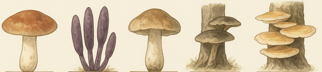 オウギタケ、シロハツ、カワリハツ、ムラサキナギナタタケ、ガンタケ、カイメンタケなどが発生しています。
