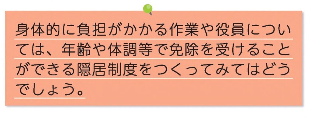 健康状態が低下し、自分らしい暮らしを継続するにあたり、区に関わることが大きな負担となってしまう場合には、ゆずる先がいなくなても、過去のように隠居を公に認めることを検討してもよい時期にきているのではないでしょうか。