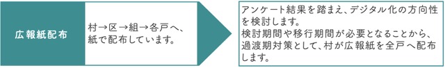 村では、全村民へ村の情報を速やかに提供すること、区役員や組長の配布作業の負担軽減をすること、ペーパーレス等を目的として、広報紙等のデジタル化(スマートフォンやタブレット、テレビ、パソコン等を活用して情報を発信する)の検討をはじめることとしました。