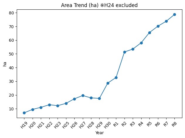 南箕輪村の水稲作付面積約220haのうち、風の村米だより(旧:森の大地)の面積の推移は下記のとおりで、順調に増加しています。