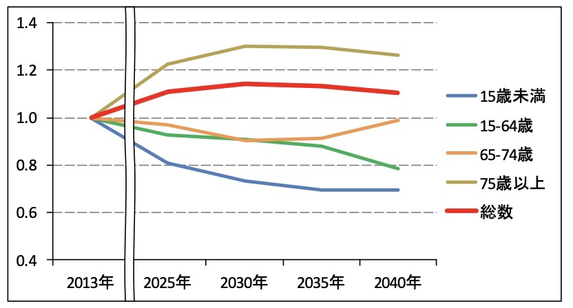 区域内に住所を有する入院患者数の推移の見込み(2013(H25)年を1 とした場合の変化率)