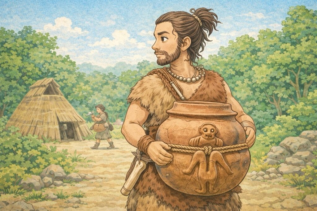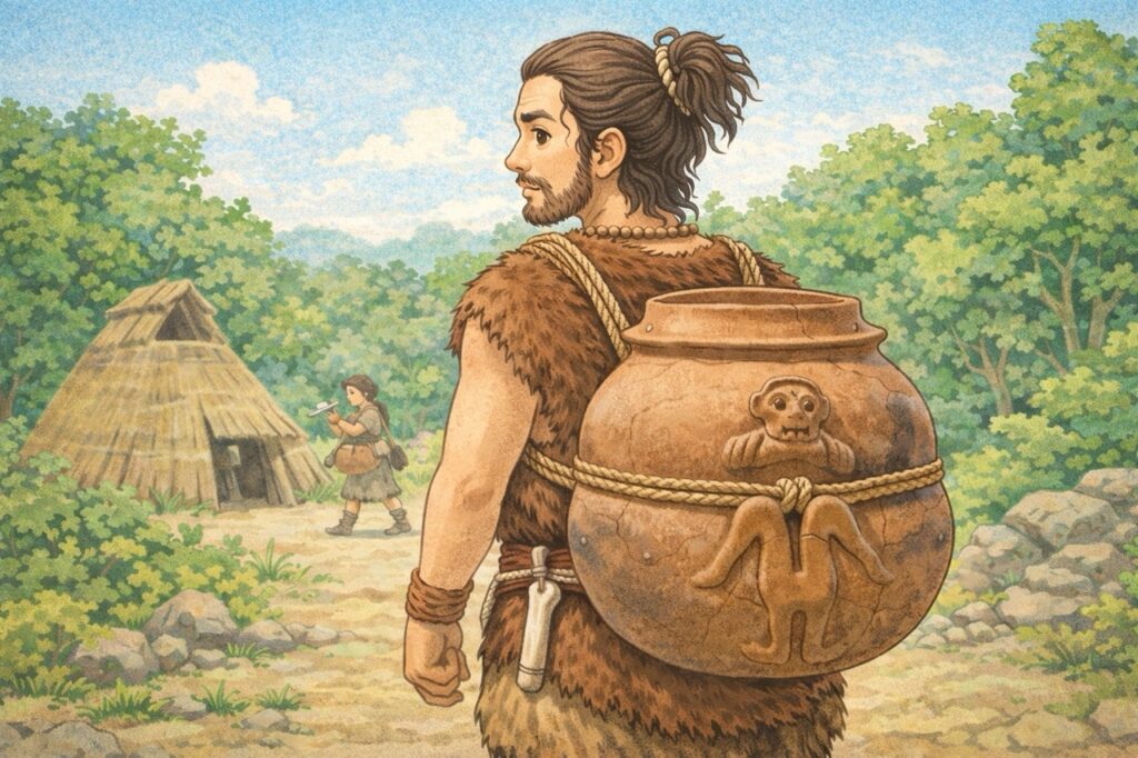 土器の中断が窪んでいるので、そこにロープ状のものを巻きつけて活用していたのかなと想像します。