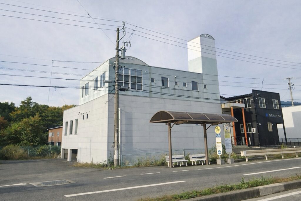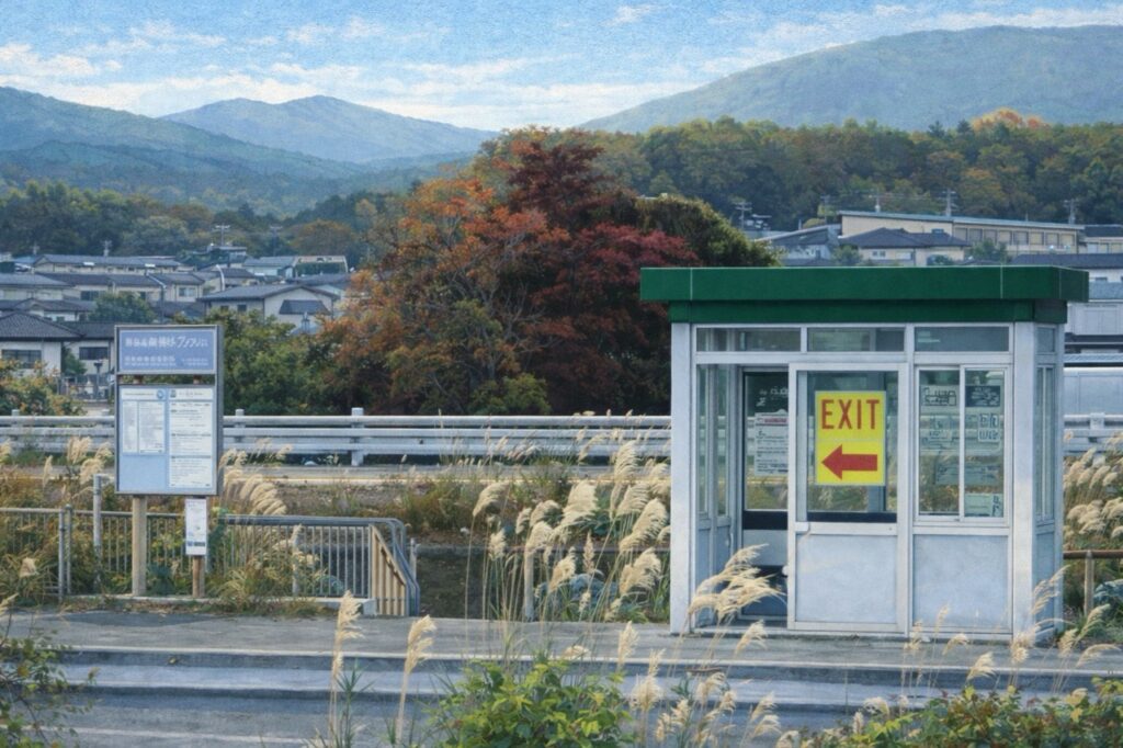 階段を登りきると、高速道路の脇線にこのようなプレハブがあります。ここが中央道伊那インターのバス停となります。