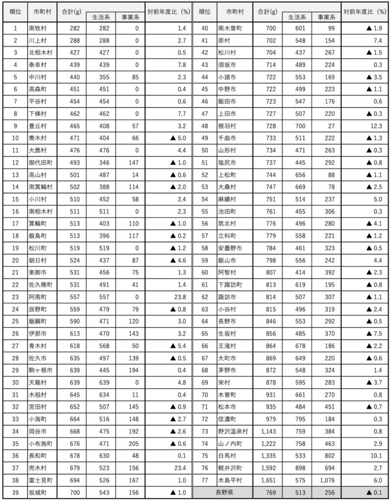 市町村 1人1日当たりのごみ排出量の令和6年度実績が長野県より発表となりました。