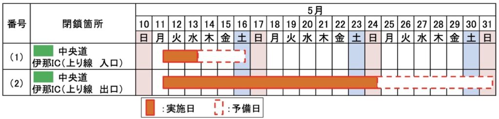 5月に中央道を使う際には、伊那ICの工事と岡谷ジャンクションの工事にはそれぞれ注意が必要ですね。
