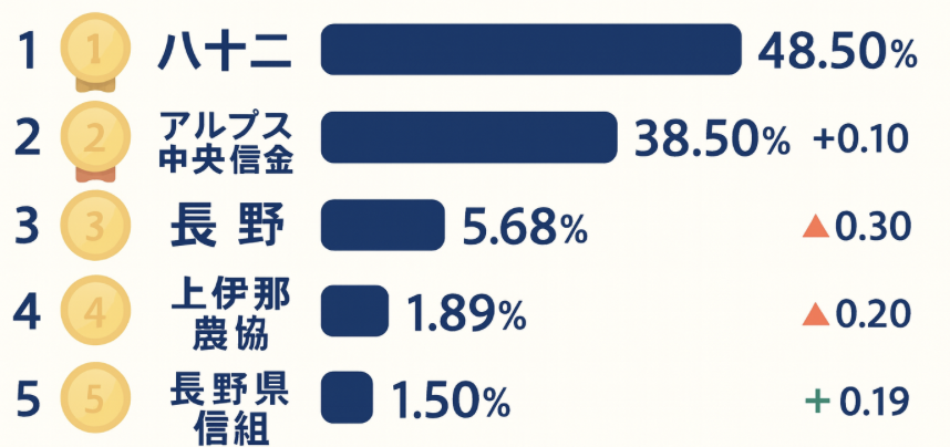 最新の帝国データバンク調査では、県内シェア53.47%にも達しています。2026年には長野銀行との合併で61.68%となる見込みです。
